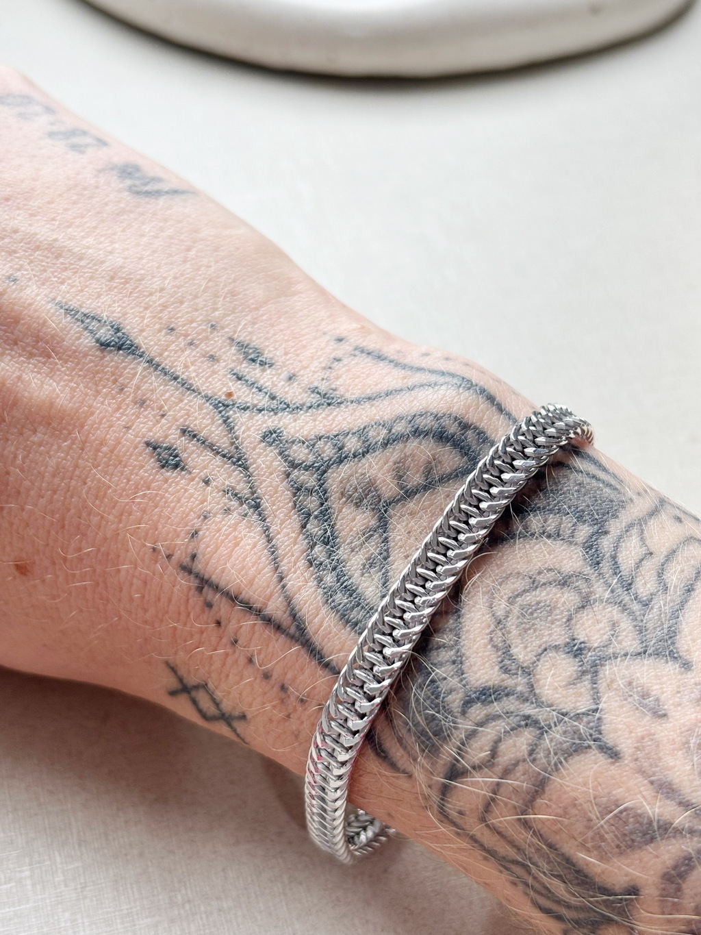 Pulseira esteira trançada em prata legítima 925, perfeita para compor um visual autêntico e cheio de personalidade.